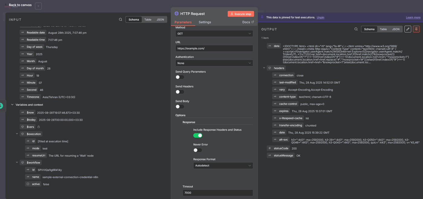 در این مرحله باید بررسی کنیم که سایت در دسترس است یا نه. برای این کار یک نود HTTP Request اضافه کنید و آن را به Schedule Trigger وصل کنید. در بخش URL آدرس سایت خود را وارد کنید (مثلاً https://example.com). متد را روی GET قرار دهید. بهتر است گزینه Timeout را روی ۷ تا ۱۰ ثانیه تنظیم کنید تا اگر سایت دیرتر پاسخ داد، بهعنوان خطا ثبت شود. با فعال کردن گزینه Include Response Headers and Status، خروجی نود شامل اطلاعاتی مانند statusCode (مثلاً 200 به معنی سالم بودن سایت) و زمان پاسخ خواهد بود.