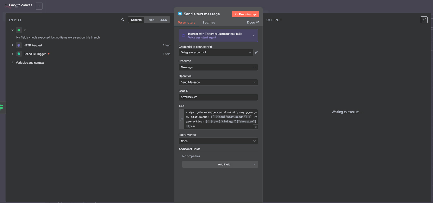 در شاخه True (وقتی سایت مشکل دارد)، یک نود Telegram از نوعSend Message اضافه کنید. در اینجا باید توکن رباتی که از ربات تلگرام BotFather گرفتهاید را وارد کنید.