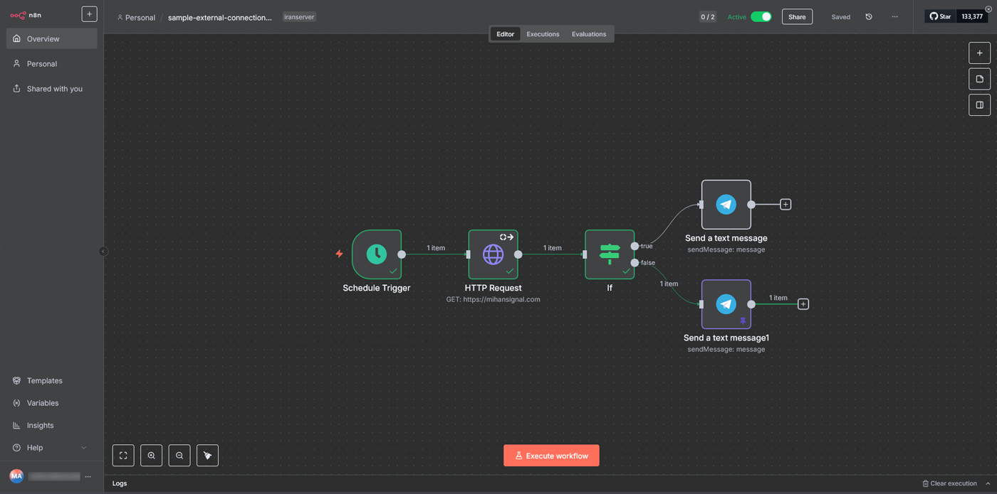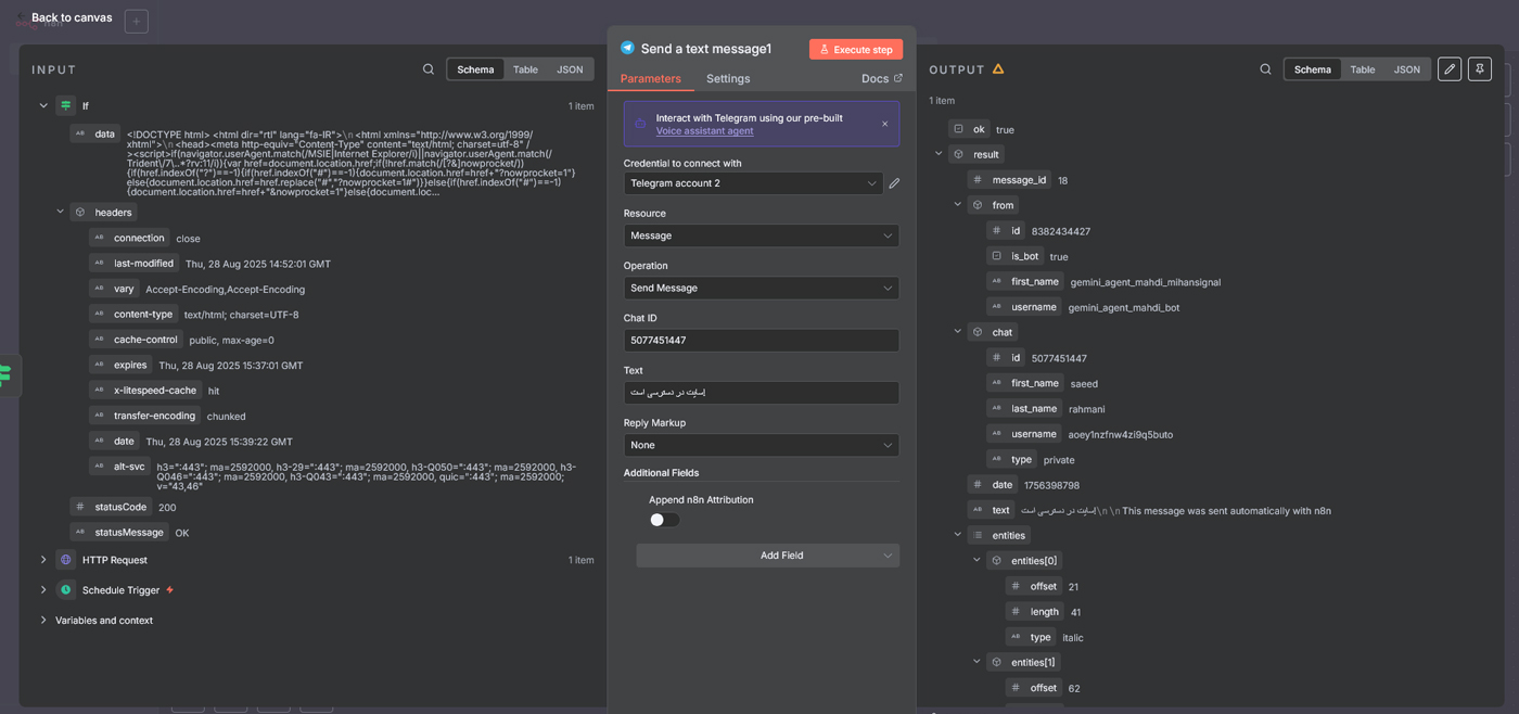 در پایان ورکفلو را ذخیره کنید و وضعیت آن را روی Active قرار دهید. برای تست میتوانید یکبار اجرای دستی بزنید و نتیجه HTTP Request را ببینید. حتی میتوانید موقتاً یک آدرس اشتباه بگذارید تا پیام هشدار به تلگرام بیاید. بعد دوباره آدرس درست را قرار دهید و مطمئن شوید همهچیز درست کار میکند.