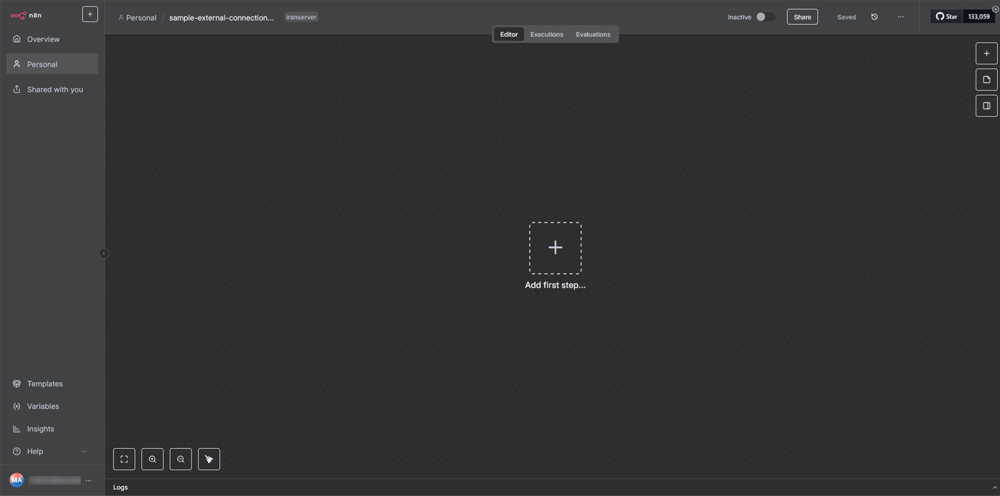 برای شروع باید وارد پنل n8n ایرانسرور شوید و یک ورکفلو جدید بسازید تا یک بوم خالی برای طراحی داشته باشید.