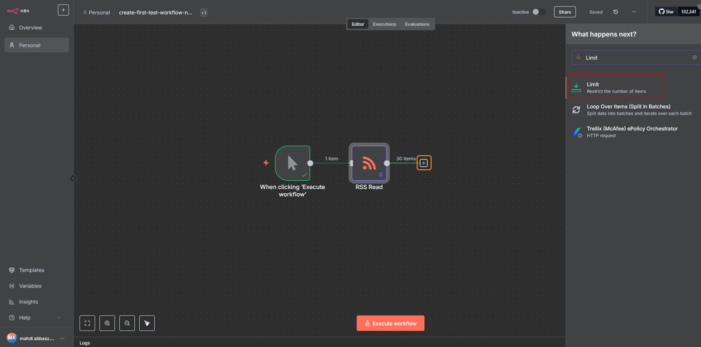 گاهی ممکن است فید خبری شامل دهها آیتم باشد، اما شما بخواهید فقط چند مورد آخر را پردازش کنید. برای همین نود Limit به کار میآید. این نود بعد از RSS قرار میگیرد و خروجی آن را محدود میکند. برای اینکار روی علامت + نود مرحله قبل کلیک کنید و از ساید بار گزینه Limit را انتخاب کنید.