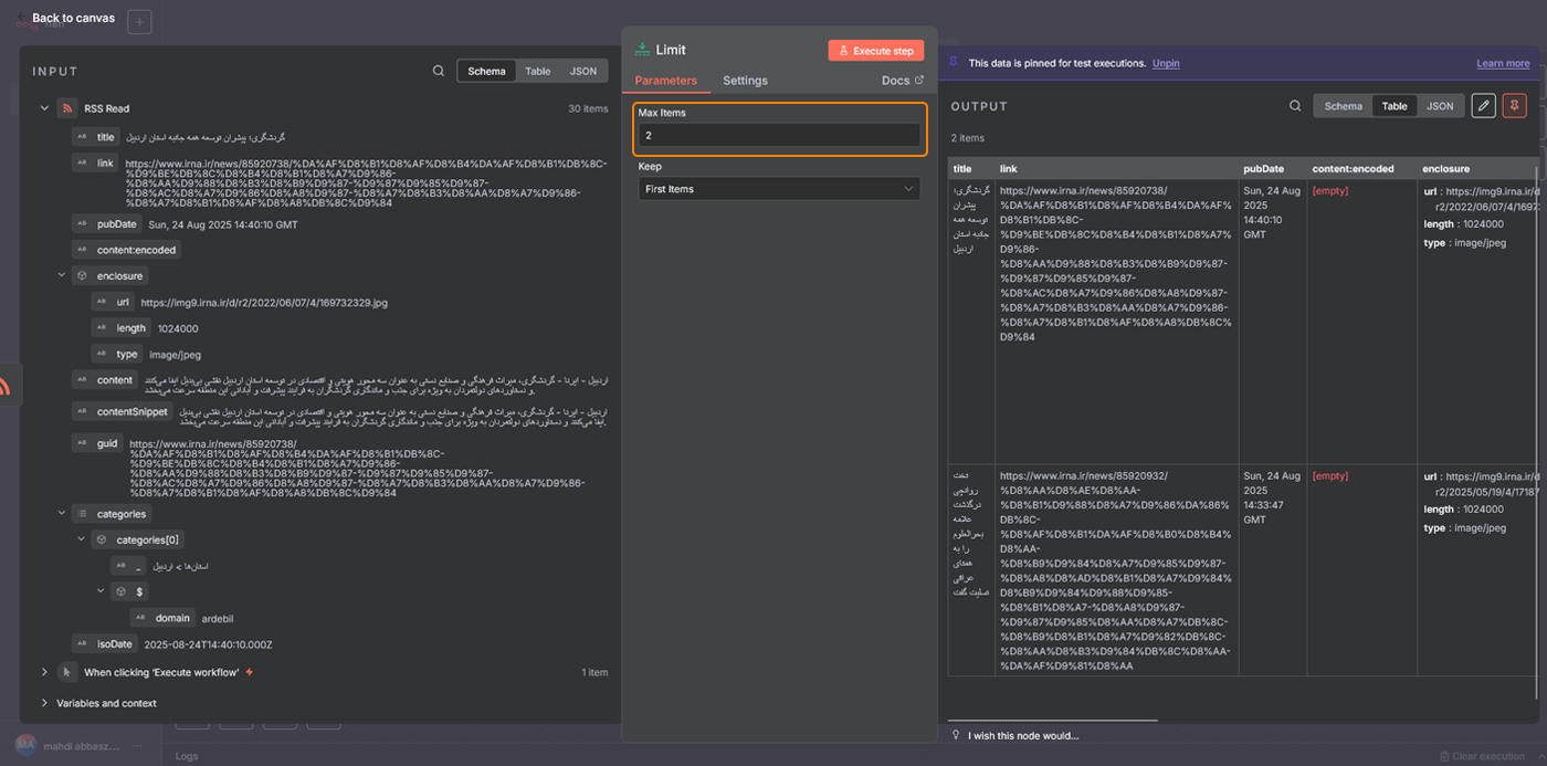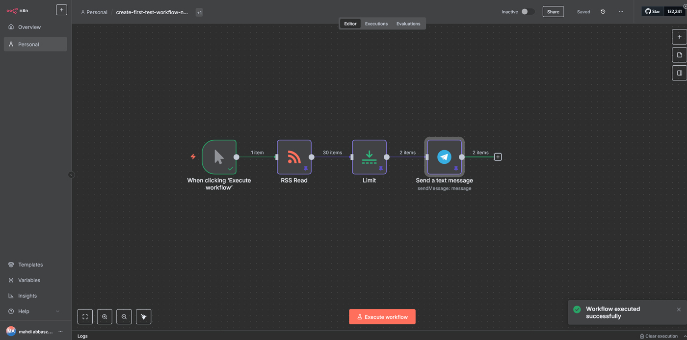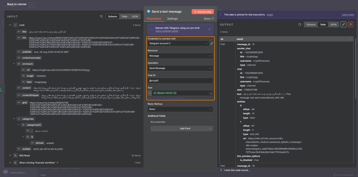 زمانی که همه نودها تنظیم شدند، کافی است روی دکمه Execute workflow کلیک کنید. اگر همهچیز درست باشد، دو پیام جدید در کانال تلگرام شما ارسال خواهد شد که هرکدام شامل عنوان یکی از خبرهای فید است. این مرحله نشان میدهد ارتباط بین نودها درست کار میکند و ربات تلگرام هم بهخوبی متصل شده است.