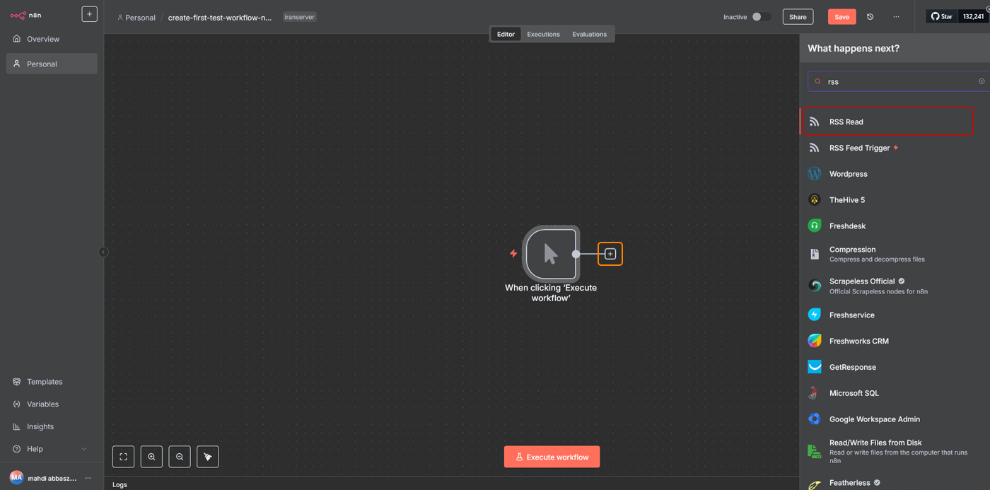 در این آموزش قصد داریم اولین ورکفلو آزمایشی خود را در n8n بسازیم. هدف این است که یک فید خبری (RSS) را بخوانیم، دو خبر آخر را انتخاب کنیم و عنوان آنها را بهصورت خودکار در کانال تلگرام ارسال کنیم.
