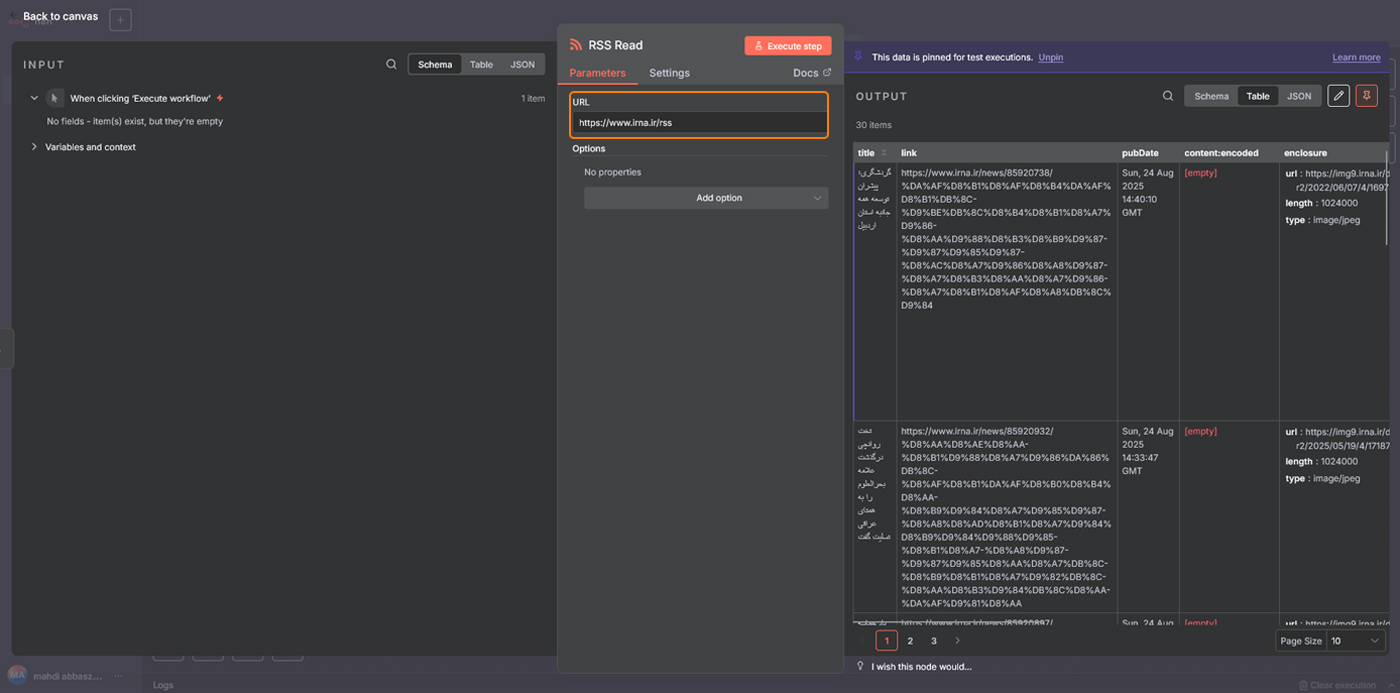 در سادهترین شکل تنظیمات، کافیست تنها فیلد URL را پر کنید. آدرس فید خبری را وارد کنید؛ برای مثال: https://example.com/rss.xml. بعد از اجرا، این نود همه آیتمهای موجود در فید را برمیگرداند که معمولاً شامل عنوان خبر، توضیح و لینک است.