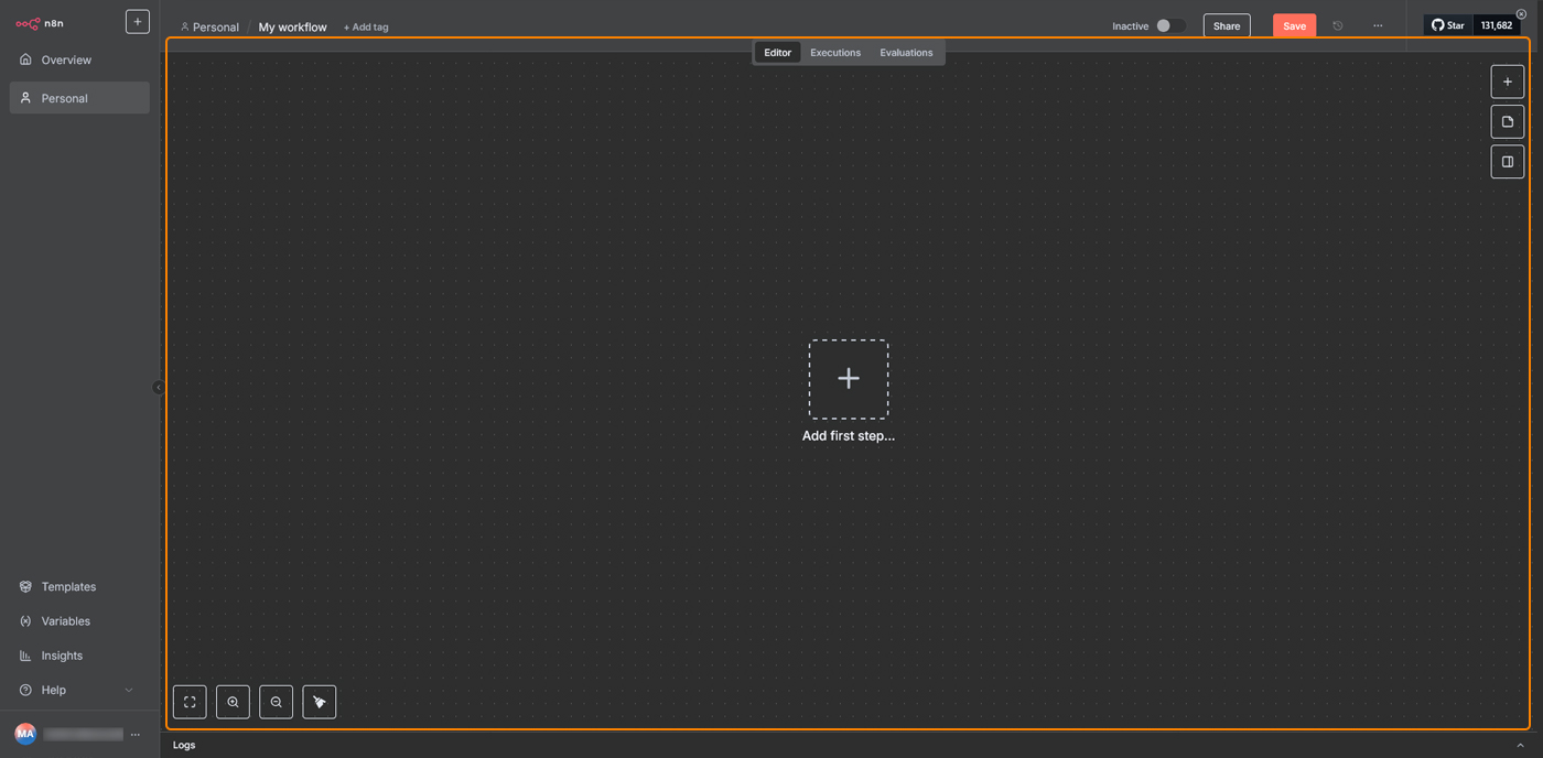بخش اصلی کار، بوم یا همان Canvas است. این بخش پس‌زمینه‌ای نقطه‌چین دارد که شما می‌توانید نودها را روی آن قرار دهید و ورک‌فلو خود را بسازید. روی بوم چند آیکون کاربردی دیده می‌شود. دکمه‌هایی برای بزرگ‌نمایی و کوچک‌نمایی وجود دارد و یک دکمه نیز برای اجرای ورک‌فلو پس از اضافه کردن اولین نود قرار گرفته است. دکمه + لیست نودها را باز می‌کند و گزینه Sticky Note امکان نوشتن توضیحات روی بوم را می‌دهد. همچنین با انتخاب گزینه “Add first step” می‌توانید اولین نود را اضافه کنید.