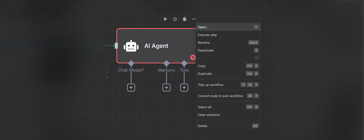 علاوه بر این، گزینه سه‌نقطه‌ای نیز وجود دارد که منوی تنظیمات بیشتر نود را باز می‌کند. این منو شامل گزینه‌هایی مثل Open برای باز کردن نود، Execute step برای اجرای همان مرحله، Rename برای تغییر نام نود، Deactivate برای غیرفعال کردن، Copy و Duplicate برای کپی یا تکرار نود است. همچنین گزینه Tidy up workflow برای مرتب‌سازی، Convert node to sub-workflow برای تبدیل یک نود به زیروورک‌فلو، Select all برای انتخاب همه نودها، Clear selection برای غیر فعال کردن انتخاب‌ها و در نهایت Delete برای حذف کامل نود در دسترس است.