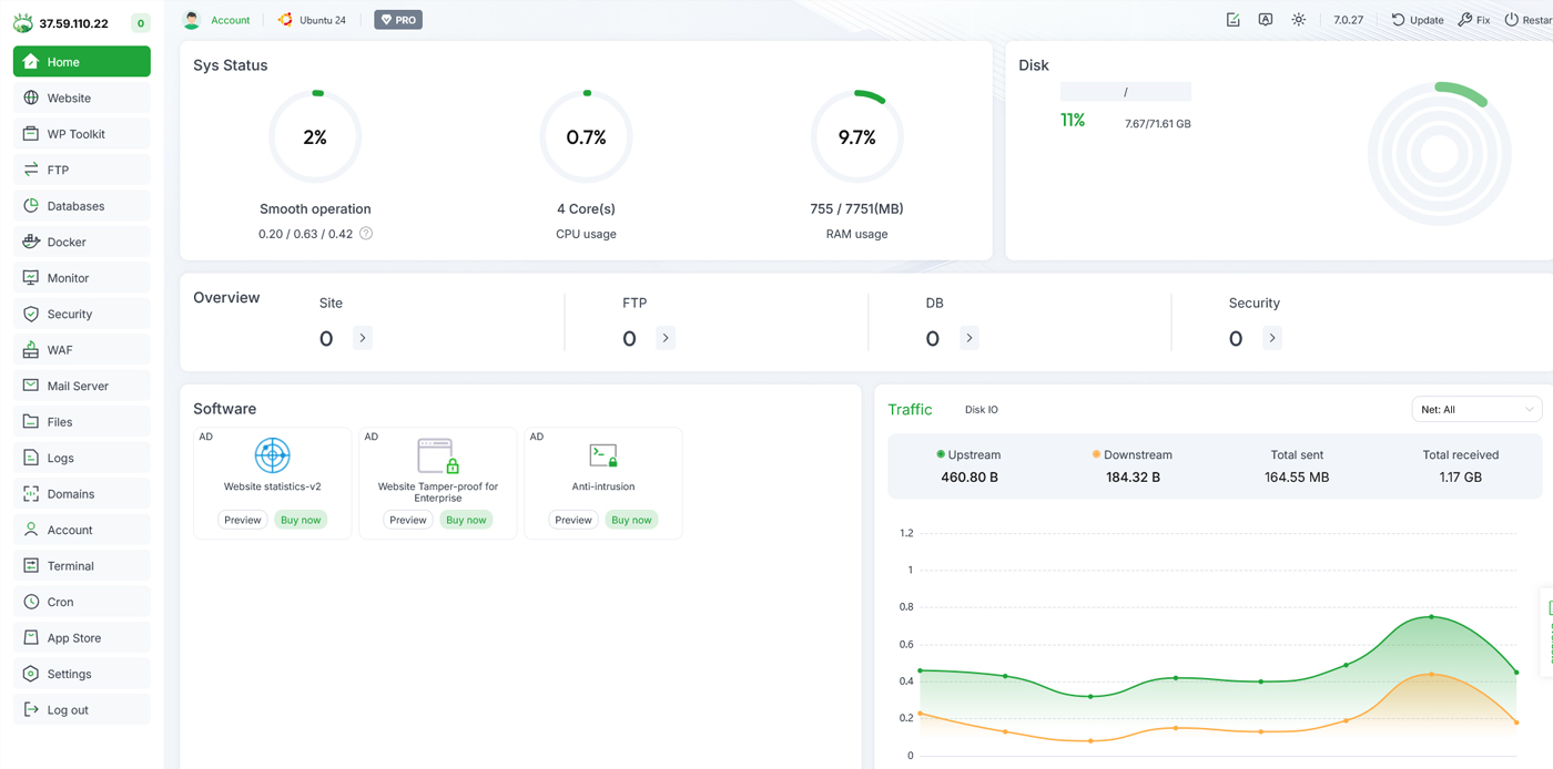 در پایان نصب، کنترل پنل aaPanel بهصورت کامل روی VPS شما فعال است و از این پس میتوانید سایتها، دیتابیسها و تنظیمات سرور را از محیط گرافیکی بهراحتی مدیریت کنید.