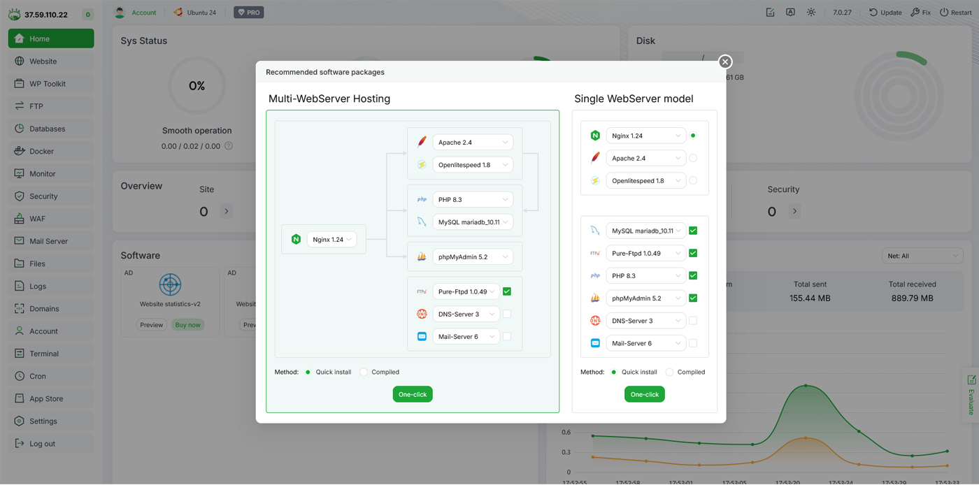 برای یک سایت شخصی که قرار است سبک، سریع و پایدار باشد، بهترین کار این است که در بخش Single WebServer Model فقط Nginx 1.24 را انتخاب کنید و در لیست سرویسها فقط موارد ضروری یعنی MySQL/MariaDB، PHP، phpMyAdmin و Pure-FTPd را فعال نگه دارید.