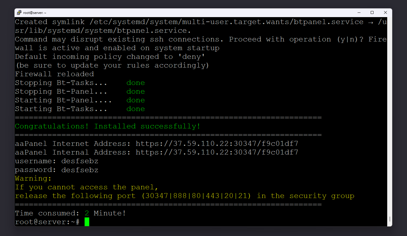 پس از پایان نصب، در ترمینال اطلاعات ورود به پنل نمایش داده میشود. آدرس معمولاً به صورت زیر است: