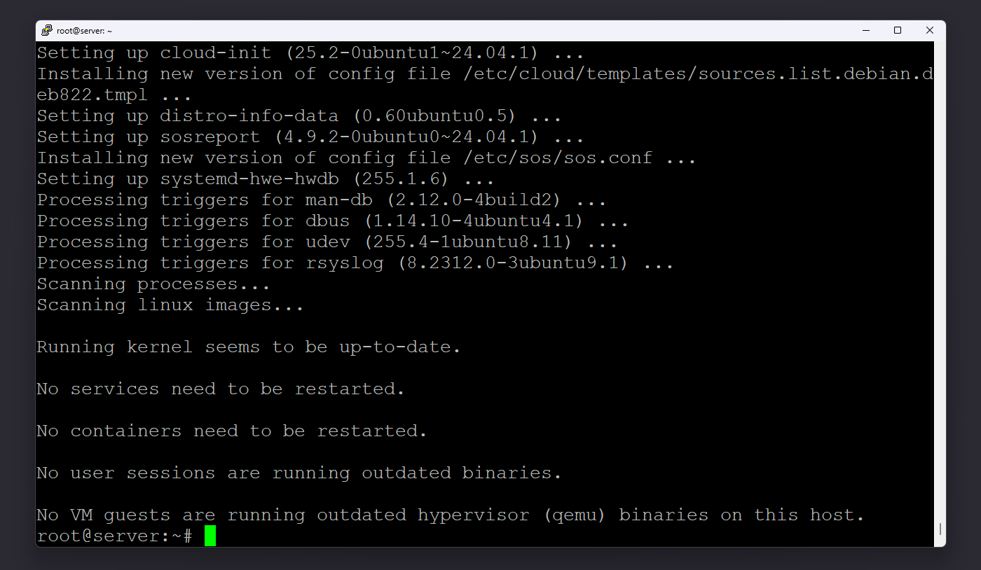 بعد از ورود به سرور از طریق SSH، ابتدا باید سیستم را بهروزرسانی کنید تا همه بستهها جدید و بدون خطا باشند. این کار باعث میشود نصب کنترل پنل بدون مشکل انجام شود.