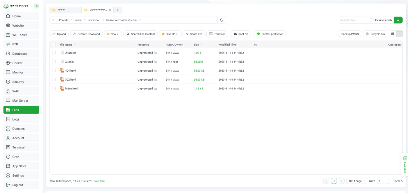 از منوی سمت چپ وارد بخش File شوید. این صفحه شبیه یک فایلمنیجر تحت وب است که امکان آپلود، حذف، جابهجایی و ویرایش فایلها را فراهم میکند. در مسیر /www/wwwroot/ پوشه دامنهای که ساخته شده قرار میگیرد. برای مدیریت فایلها وارد همین پوشه شوید.