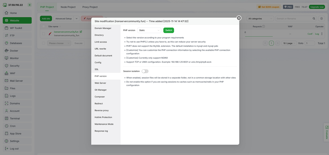 اگر سایت شما با PHP اجرا میشود باید نسخه مناسب انتخاب شود. به بخش Website برگردید و روی دکمه conf از دامنه مورد نظر کلیک کنید. در بخش PHP Version نسخه سازگار با سایت خود را انتخاب کنید. نصب افزونههای لازم مثل Zip، Curl یا GD نیز از بخش App Store ممکن است. انتخاب نسخه نادرست PHP ممکن است باعث خطای سفید یا 500 شود.