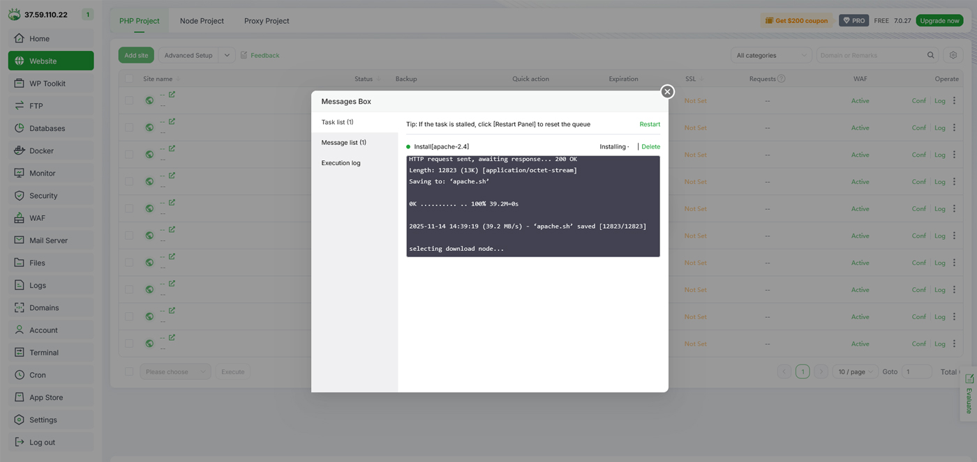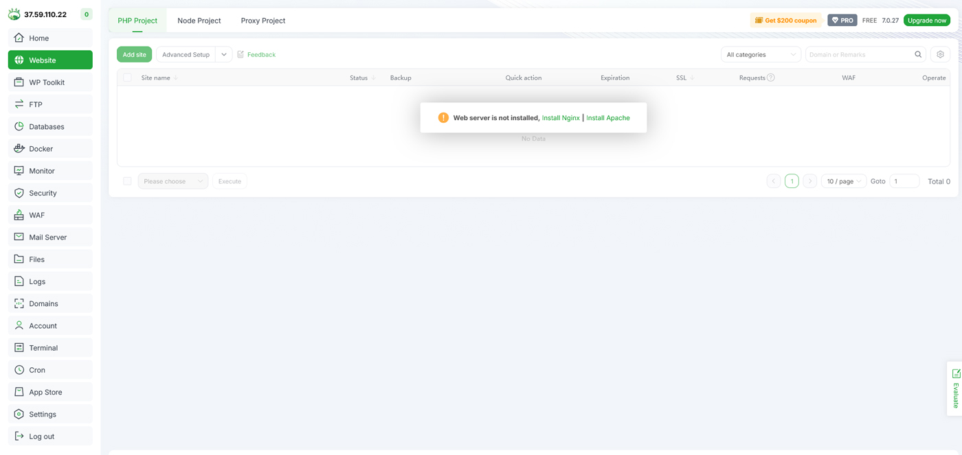 برای این منظور کافیست روی لینک install Apache یا Install Nginx کلیک کنید تا وبسرور مورد نظر شما به صورت خودکار نصب شود.