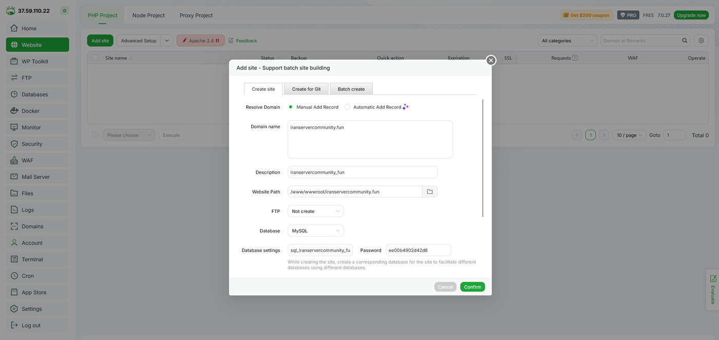 مرحله سوم: ایجاد وبسایت جدید در aapanel
