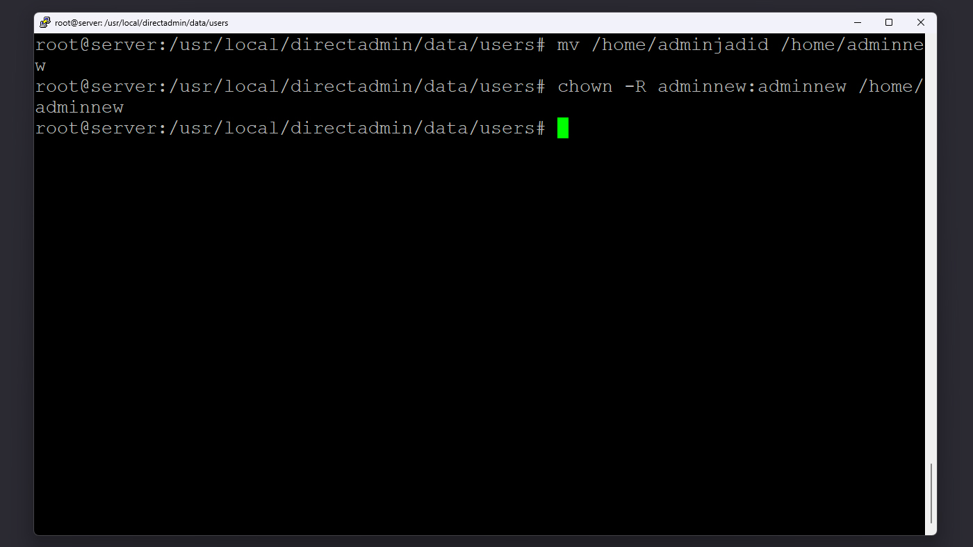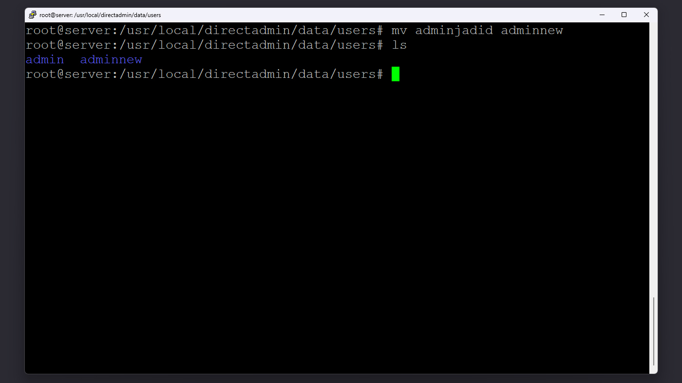در این روش باید باید نام پوشه مربوط به کاربر فعلی را تغییر دهید. هر پوشه در مسیر /usr/local/directadmin/data/users شامل تمام تنظیمات و اطلاعات مربوط به آن کاربر است. بنابراین با دستور زیر، نام کاربری را از مقدار فعلی به مقدار جدید تغییر دهید: