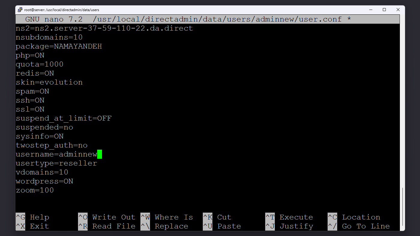nano /usr/local/directadmin/data/users/newuser/user.conf