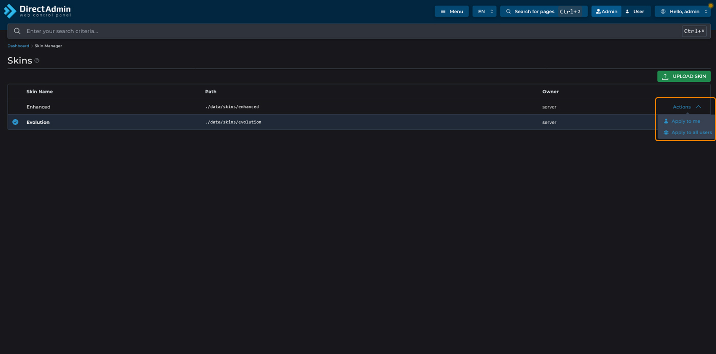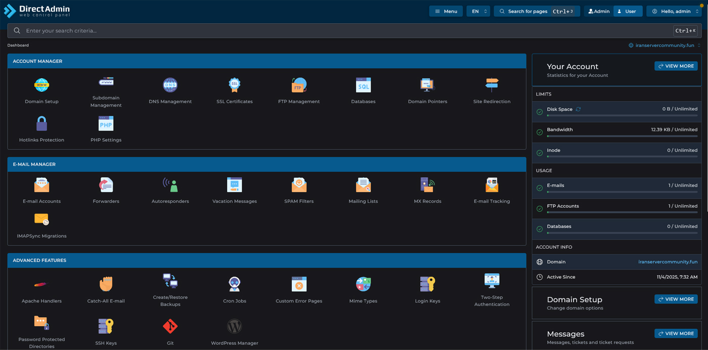 • در نسخه‌های جدید دایرکت‌ادمین معمولاً تم Evolution به عنوان گزینه پیش‌فرض فعال است که رابطی مدرن، سریع و سازگار با موبایل دارد. اگر از تم قدیمی Enhanced استفاده می‌کنید و احساس می‌کنید رابط کاربری کند یا قدیمی است، بهتر است به Evolution مهاجرت کنید.