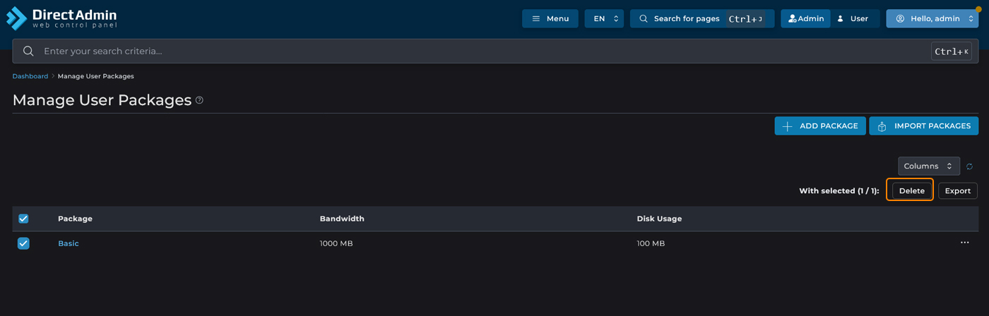 برای تغییر منابع پکیج، کافیست در همان بخش Manage User Packages روی نام پکیج کلیک کرده و مقادیر موردنظر را ویرایش کنید. سپس روی Save کلیک کنید تا تغییرات ذخیره شوند. اگر پکیجی دیگر استفاده نمی‌شود، می‌توانید تیک آن را زده و گزینه‌ی Delete را انتخاب کنید. البته اگر پکیج هنوز برای کاربران فعال است، حذف آن ممکن است باعث خطا در اکانت‌های فعلی شود؛ بنابراین بهتر است ابتدا کاربران را به پکیج جدید منتقل کنید.