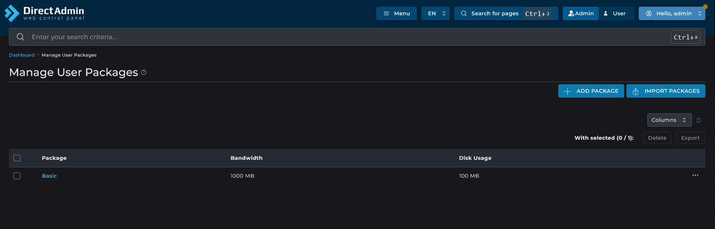 بعد از ورود، از منوی اصلی به بخش Account Manager بروید و گزینه‌ی Manage User Packages را انتخاب کنید. این بخش مخصوص مدیریت تمام پکیج‌های کاربری است. در اینجا می‌توانید پکیج‌های جدید بسازید، پکیج‌های فعلی را ویرایش یا حذف کنید و منابع هر سرویس را کنترل کنید. در حالت پیش‌فرض اگر تا حالا پکیجی ایجاد نکرده باشید، این لیست خالی است.