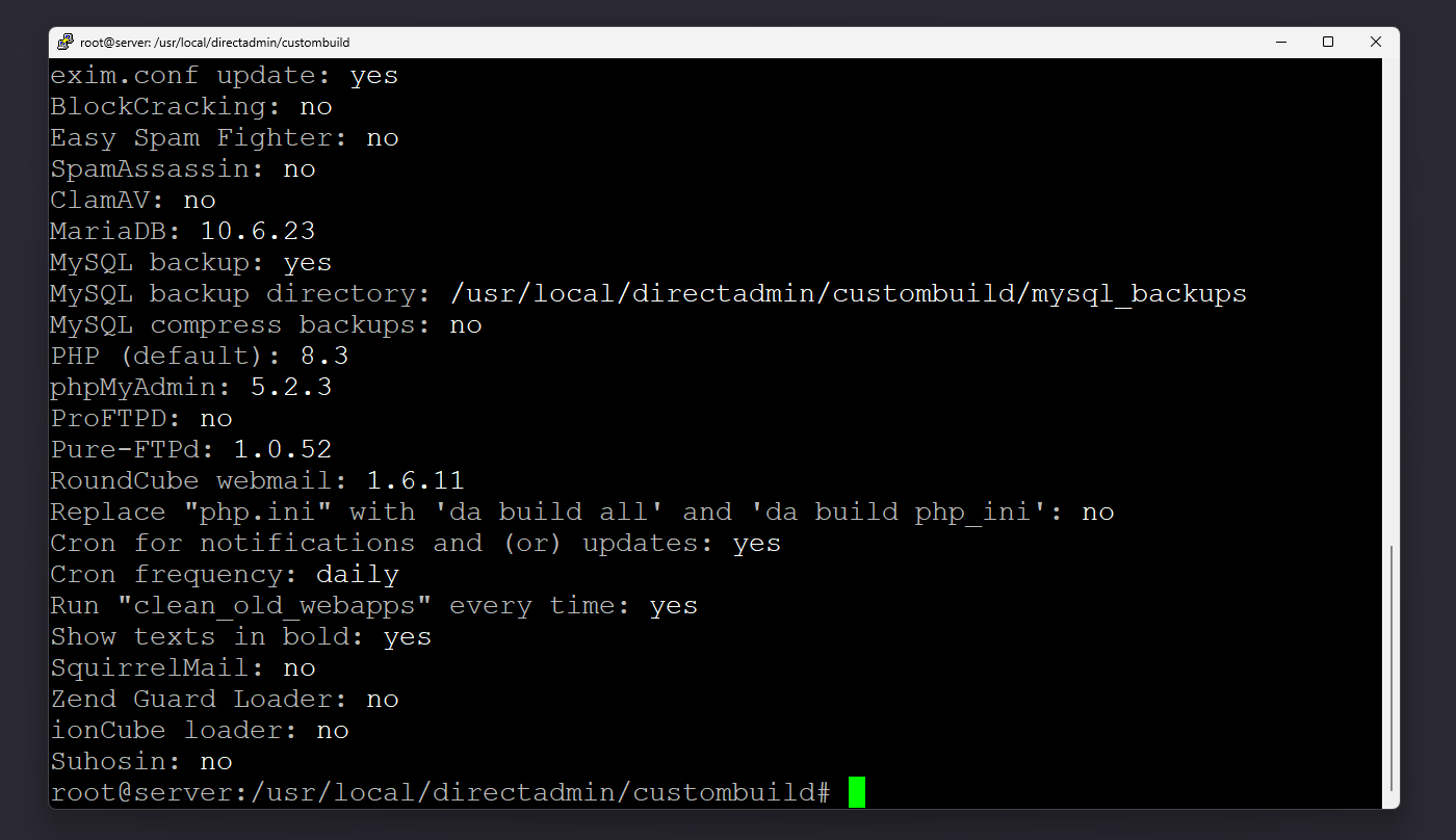 اگر ورژن CustomBuild شما آخرین نسخه باشد، پیام directadmin current x.x is already latest را مشاهده می‌کنید.