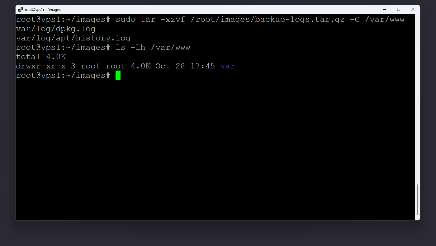 هر زمان نیاز داشتید دادهها را بازیابی کنید، میتوانید فایل بکاپ را در مسیر دلخواه استخراج کنید. دستور زیر برای این کار استفاده میشود: