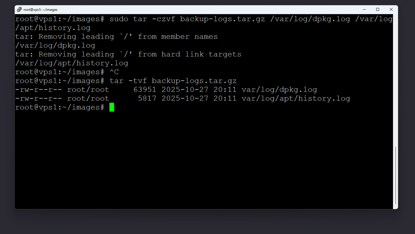 sudo tar -czvf backup-logs.tar.gz /var/log/dpkg.log /var/log/apt/history.log