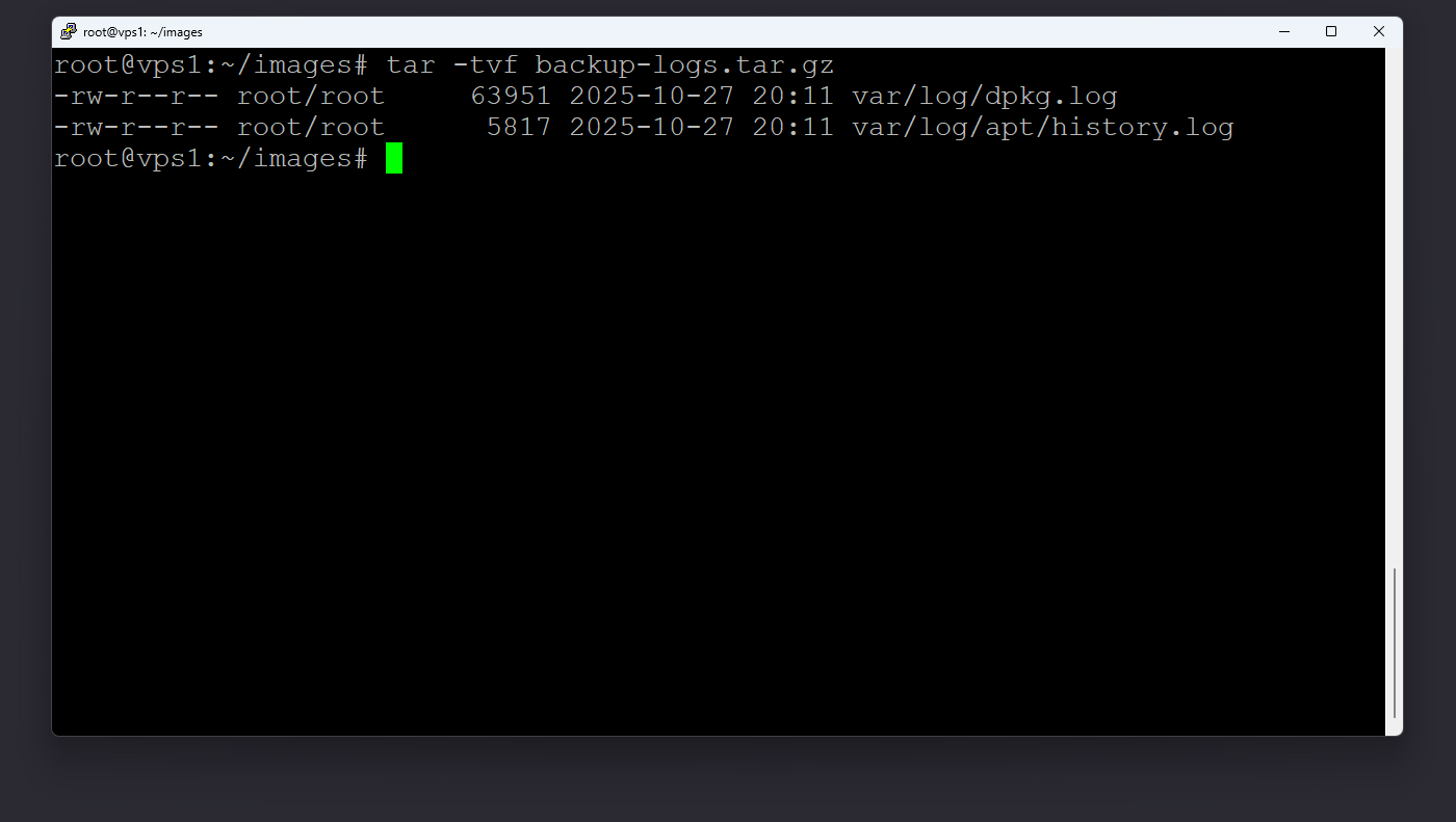 این دستور محتویات فایل بکاپ را بدون استخراج آن نمایش میدهد. اگر نام فایلها و پوشههای مورد نظر را مشاهده کردید، یعنی بکاپ شما بهدرستی گرفته شده است.