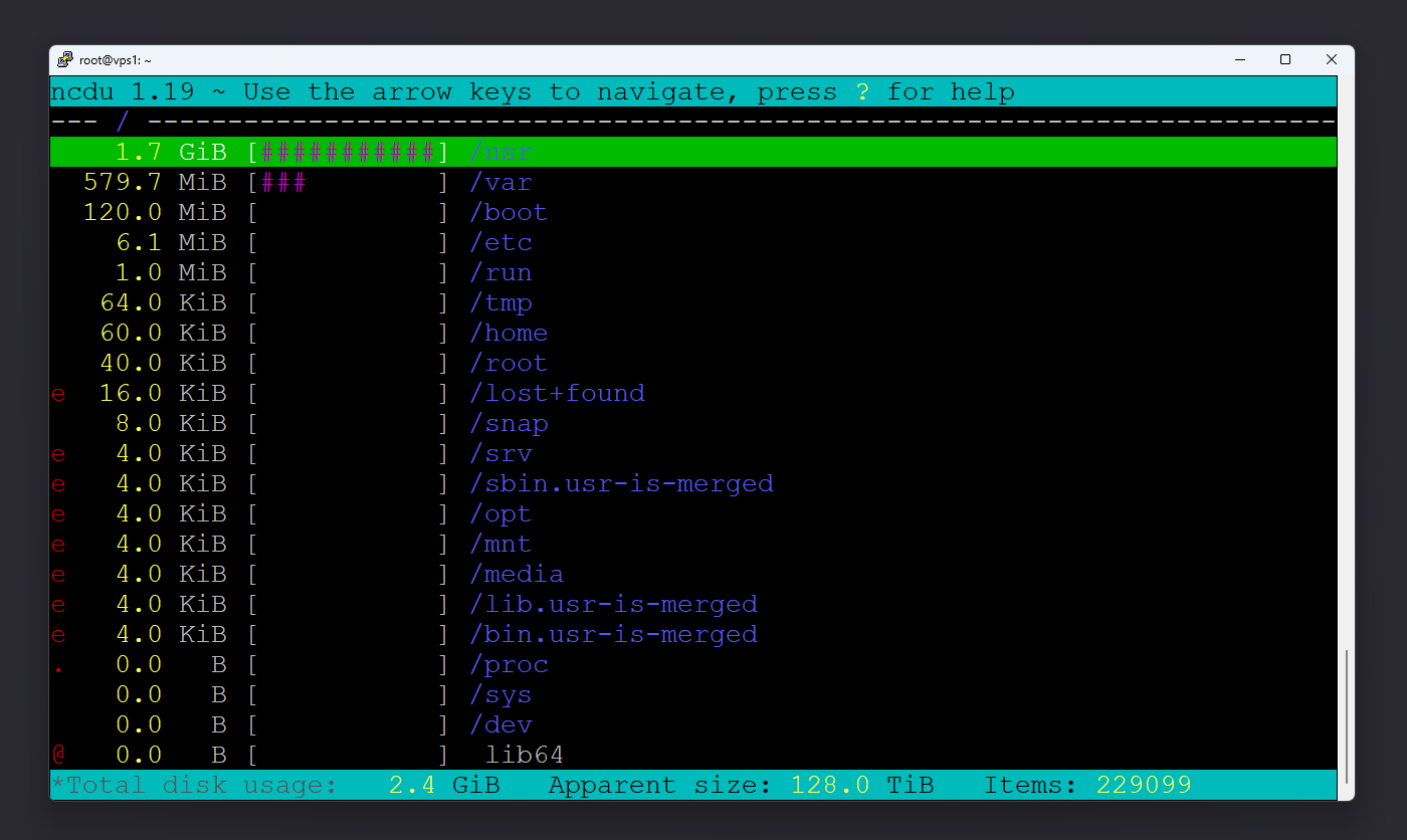 اگر بخواهید در محیطی تعاملیتر حجم فولدرها را مشاهده کنید، ابزار ncdu انتخاب بهتری است. این ابزار در واقع نسخهی گرافیکی متنی دستور du است و به شما اجازه میدهد در ترمینال بین دایرکتوریها حرکت کنید و فایلهای حجیم را سریعتر شناسایی نمایید.