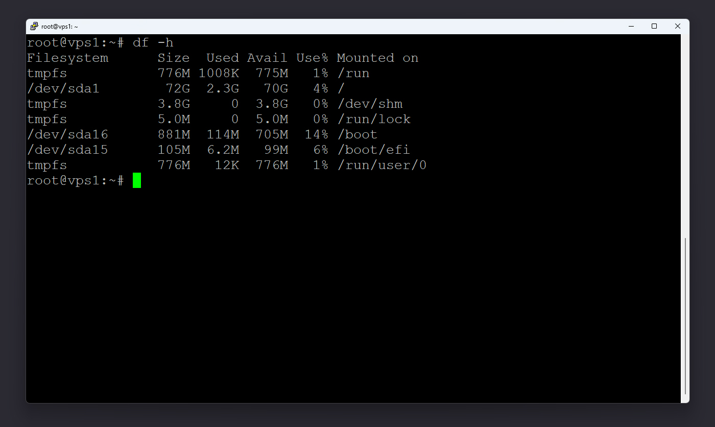 بعد از ورود به سرور از طریق SSH، اولین قدم این است که بدانید چه مقدار از فضای دیسک شما در حال حاضر اشغال شده است. برای این کار باید از دستور زیر استفاده کنید: