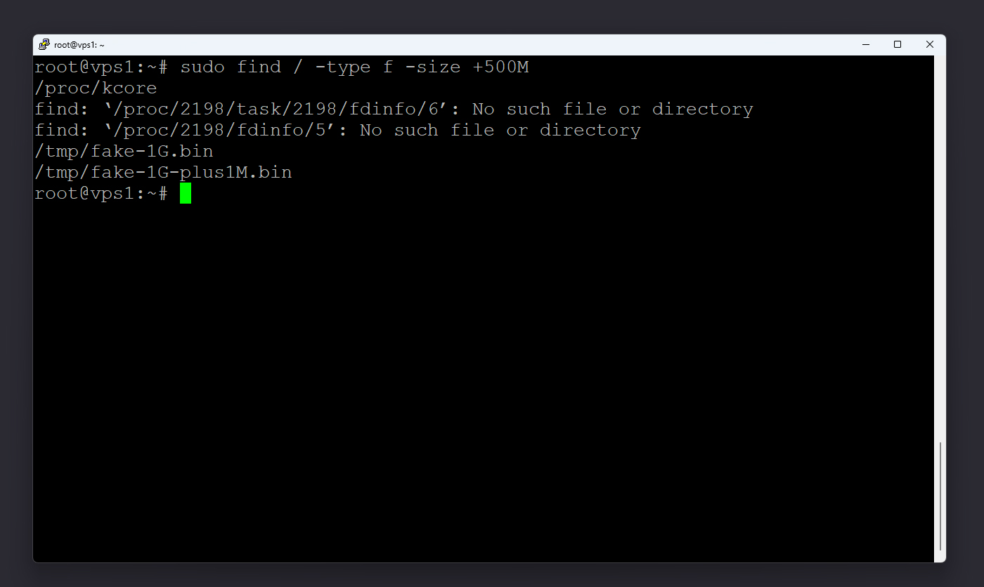 گاهی برخی فایلهای حجیم مانند بکاپها یا خطاهای بزرگ نرمافزاری در مسیرهای غیرمنتظره ذخیره میشوند. برای شناسایی آنها میتوانید از دستور زیر استفاده کنید. این دستور تمام فایلهایی را که بیش از ۱ گیگابایت حجم دارند لیست میکند: