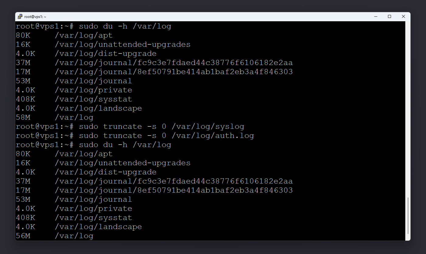 اگر فایلهای بزرگی مثل syslog یا auth.log دارید، میتوانید بدون حذف خود فایل، محتوای آن را خالی کنید تا فضا آزاد شود: