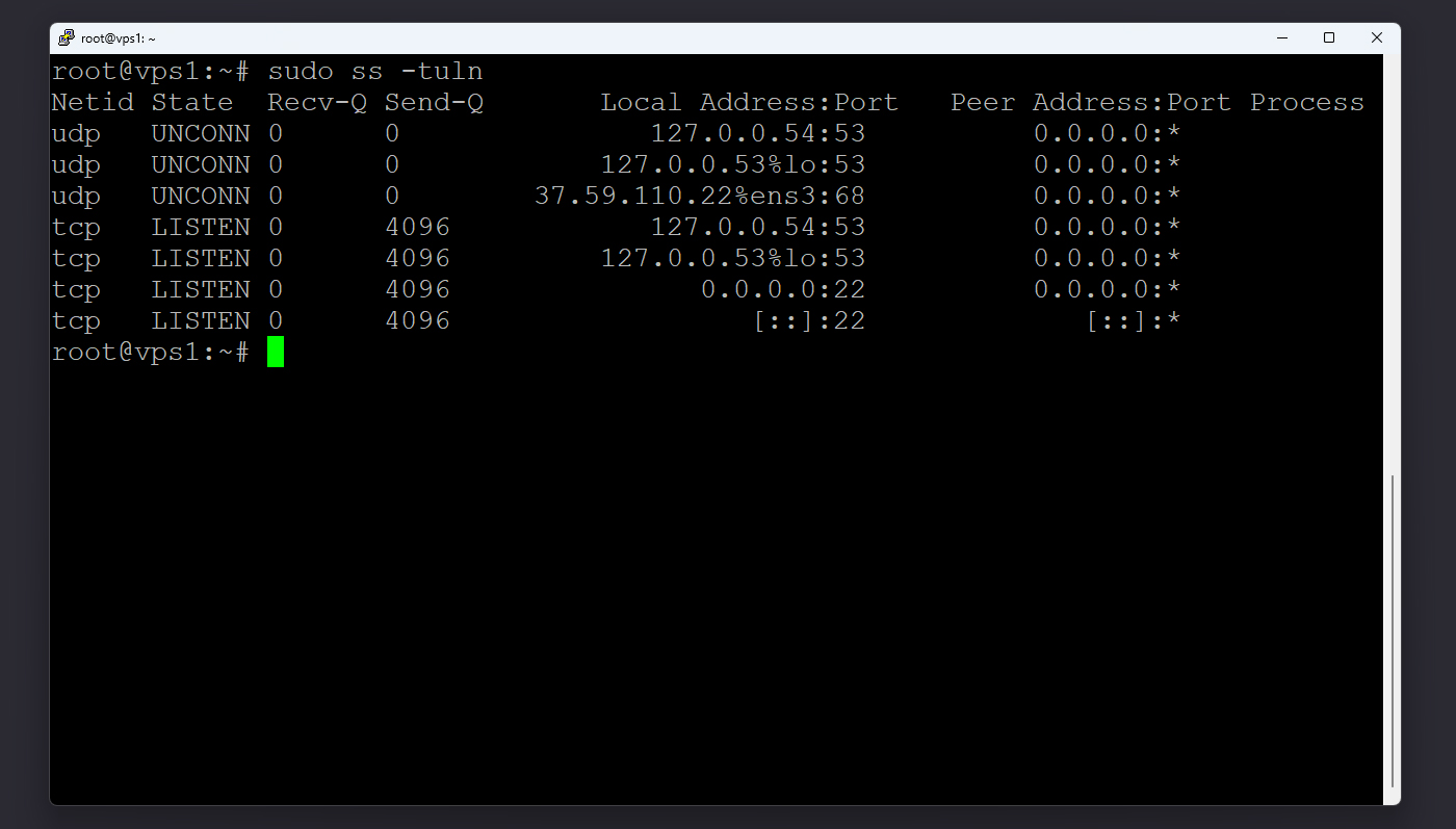 در خروجی این دستور، پورت‌هایی که در حالت گوش دادن (LISTEN) هستند نمایش داده می‌شوند. ستون Local Address:Port پورت‌های فعال را نشان می‌دهد و ستون Netid مشخص می‌کند که ارتباط TCP است یا UDP. این روش ساده‌ترین راه برای دیدن پورت‌های باز در سیستم است.
