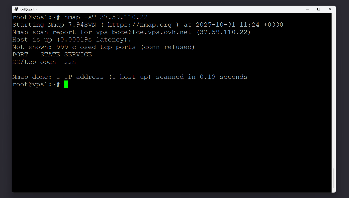 اگر هیچ نتیجه‌ای نشان داده نشد، یعنی پورت با موفقیت بسته شده است. برای بررسی از دید بیرونی نیز می‌توانید مجدداً از nmap استفاده کنید تا مطمئن شوید تغییرات به‌درستی اعمال شده‌اند.