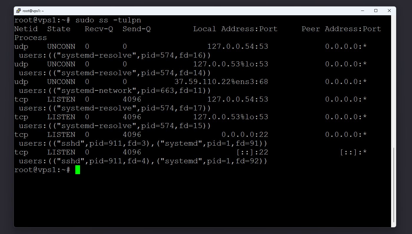 این دستور علاوه بر شماره پورت، نام سرویس و شناسه‌ی پردازش (PID) مربوط به آن را هم نمایش می‌دهد. به‌عنوان مثال ممکن است خروجی شامل sshd/743 برای پورت 22 یا nginx/1067 برای پورت 80 باشد. این اطلاعات کمک می‌کند برنامه‌هایی را که نباید فعال باشند، شناسایی کنید.