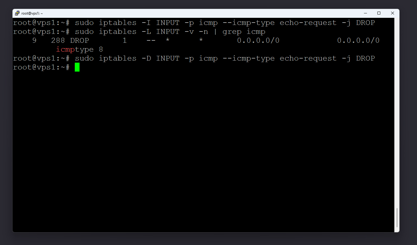 این قانون باعث میشود هر بسته ICMP از نوع echo-request (همان ping) نادیده گرفته شود و سرور هیچ پاسخی ارسال نکند.