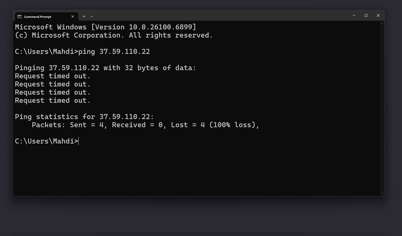 بهجای IP-address، آدرس IP سرور خود را وارد کنید. اگر پاسخی دریافت نکردید یا پیامی مانند Destination Host Unreachable یا Request timed out ظاهر شد، یعنی سرور شما دیگر به پینگ پاسخ نمیدهد و تنظیمات درست انجام شدهاند.