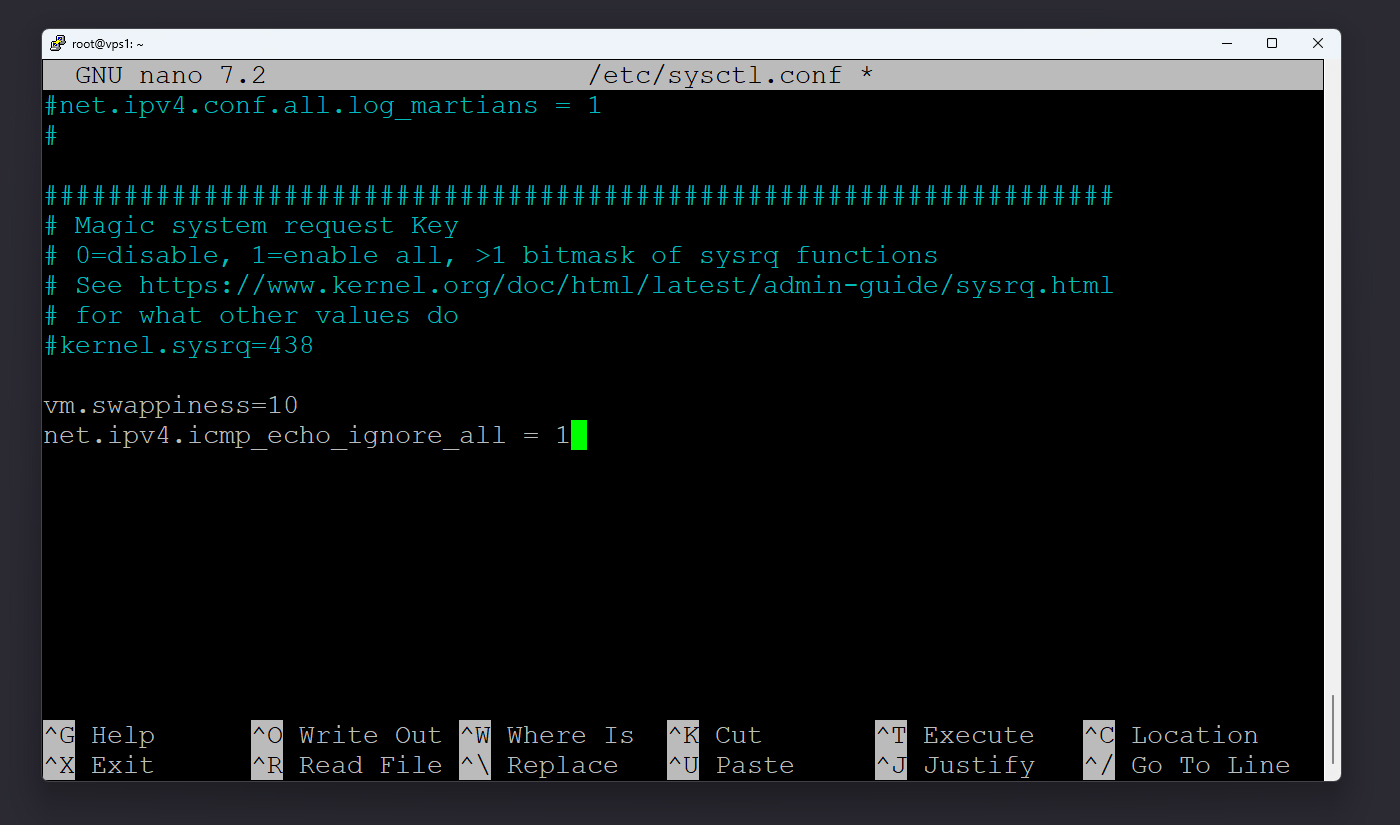 مرحله سوم: غیرفعالکردن دائمی Ping در فایل sysctl.conf