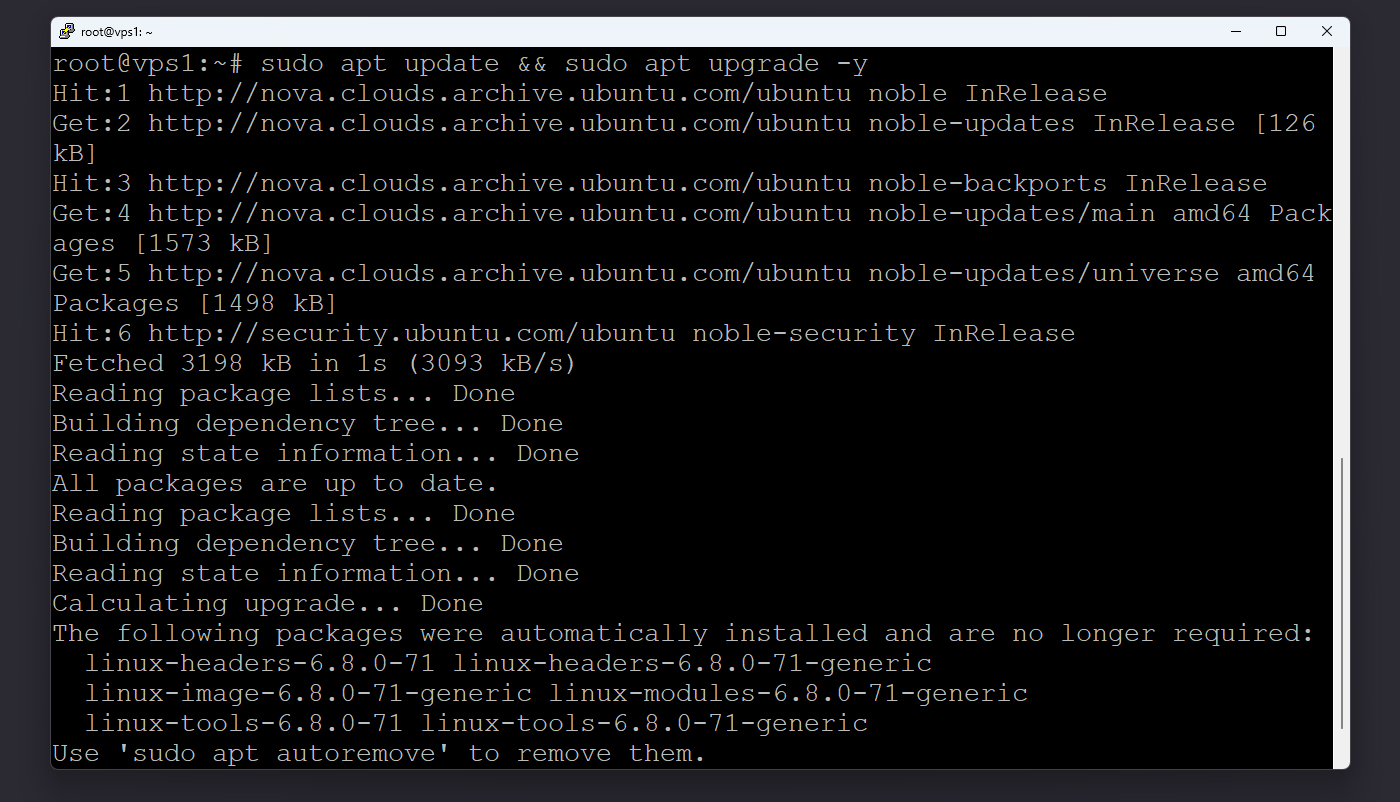 بعد از ورود به سرور از طریق SSH، ابتدا باید سیستم را بهروز کنید تا در مراحل نصب با خطایی مواجه نشوید. در سیستمهای Ubuntu یا Debian دستور زیر را اجرا کنید: