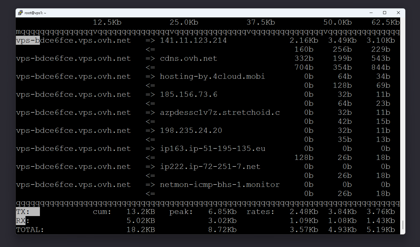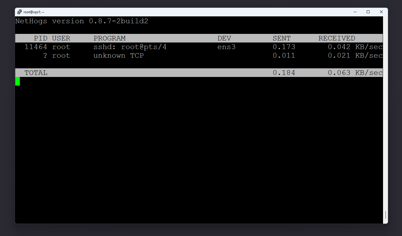 در حالی که دو ابزار قبلی بیشتر روی ترافیک کلی و اتصالات تمرکز دارند، nethogs به شما نشان میدهد کدام فرآیند یا برنامه روی سرور بیشترین ترافیک را مصرف میکند. این ویژگی زمانی مفید است که بخواهید بفهمید کدام سرویس (مثل Nginx، MySQL یا SSH) ترافیک زیادی تولید کرده است.
