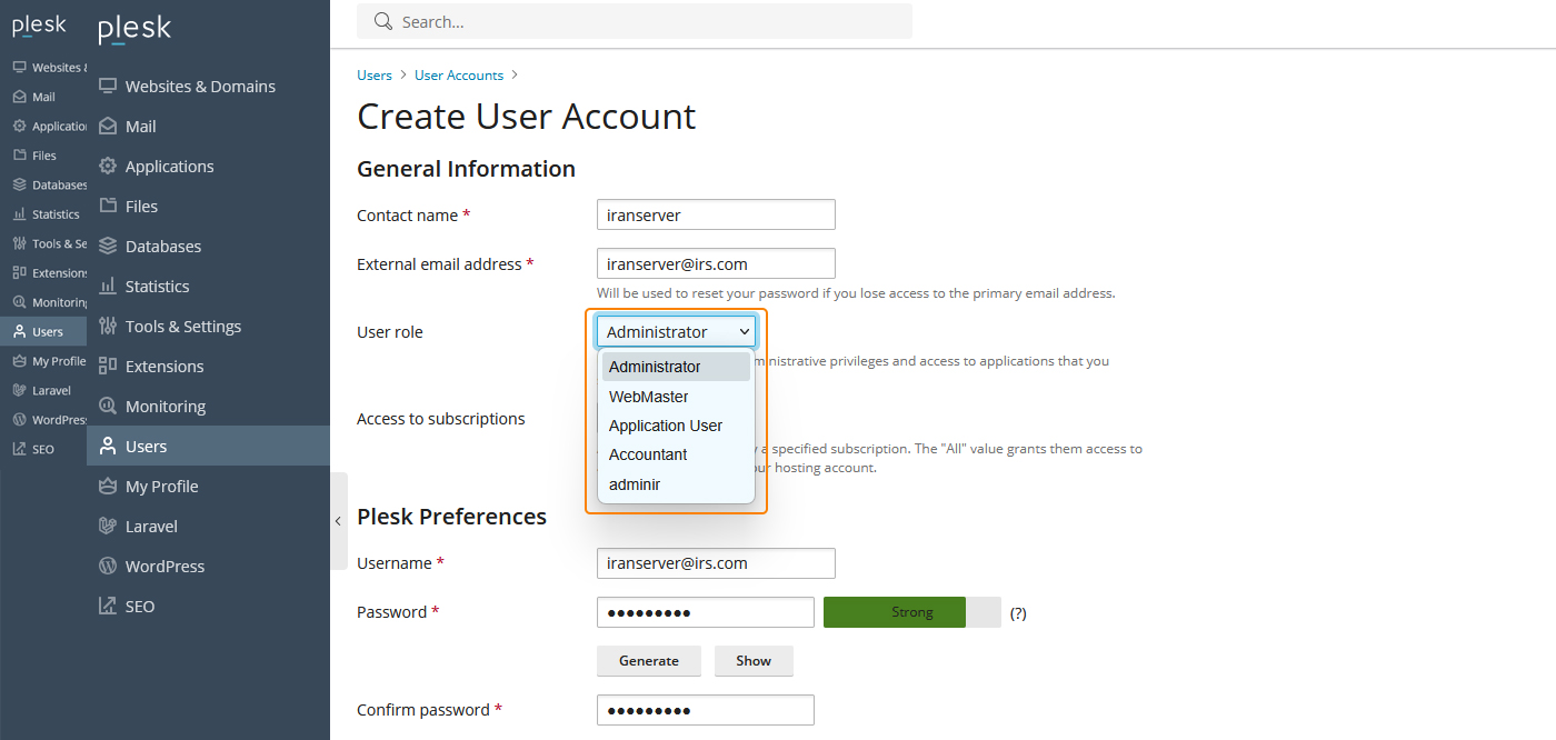 نقش یا Role در پلسک تعیین میکند که هر کاربر چه کارهایی میتواند انجام دهد. کاربر Administrator به همه بخشهای سرور و تنظیمات دسترسی کامل دارد و برای مدیریت کلی استفاده میشود. نقشهای محدودتر برای زمانی مناسب هستند که نمیخواهید یک کاربر به همه تنظیمات حساس دسترسی داشته باشد. این ساختار به شما کمک میکند چندین وبسایت را روی یک VPS ویندوزی بهصورت امن و کنترلشده مدیریت کنید و هر کاربر فقط به بخش مورد نیاز خود دسترسی داشته باشد.