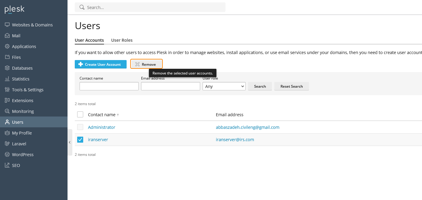 زمانی که یک کاربر دیگر نیازی به دسترسی ندارد باید حذف شود. در صفحه Users کافیست تیک کنار نام کاربر مورد نظر را فعال کنید و روی دکمه Remove کلیک کنید. پلسک قبل از حذف نهایی پیام تایید نمایش میدهد تا از اشتباه جلوگیری شود. با تایید این پیام اکانت کاربر حذف میشود و دسترسی او به پنل پلسک به طور کامل قطع خواهد شد.