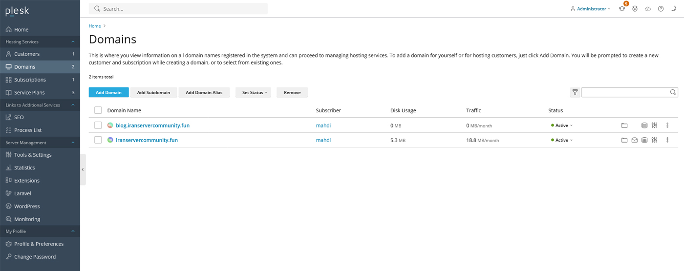 بعد از ورود به پلسک صفحه اصلی شامل گزینه Domains است. این بخش محل مدیریت تمام دامنه‌هایی است که روی سرور میزبانی شده‌اند. با واردشدن به این قسمت می‌توانید هر دامنه را به‌صورت مجزا مدیریت کنید و به تنظیمات فنی مانند فایل‌ها، DNS ،SSL و همچنین بخش‌های مربوط به MIME Types و Handler Mappings دسترسی داشته باشید. برای ادامه کافیست روی دامنه‌ای که قصد تنظیم آن را دارید کلیک کنید تا وارد صفحه مدیریت آن دامنه شوید.