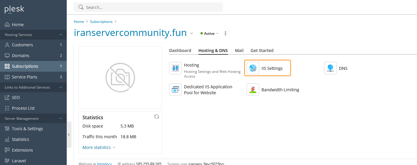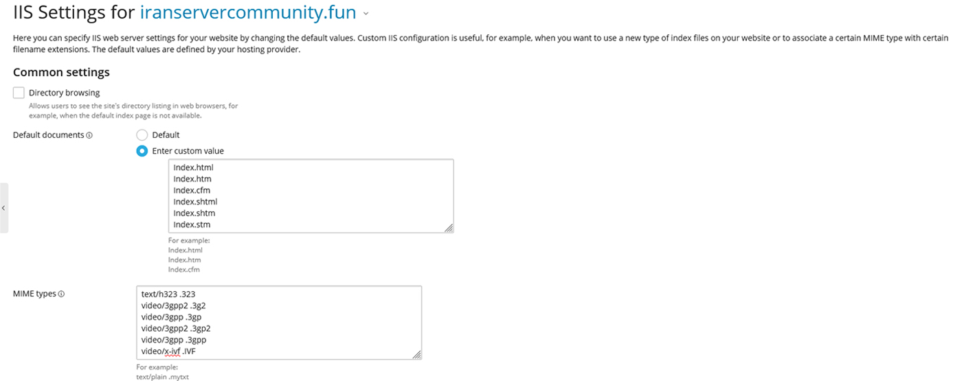 پس از ورود به صفحه مدیریت دامنه از بخش Hosting & DNS گزینه IIS Settings را انتخاب کنید. در این قسمت بخشی با عنوان MIME types قرار دارد که برای مشخص‌کردن نحوه ارسال و اجرای فایل‌ها در مرورگر استفاده می‌شود. اگر فایل‌هایی مانند JSON یا SVG یا WebP یا فونت‌ها یا برخی فایل‌های خاص اسکریپت در سایت شما به درستی اجرا نمی‌شوند معمولاً نیازی به تغییر در کد سایت نیست و فقط باید MIME type درست آن فایل را در همین بخش اضافه کنید.