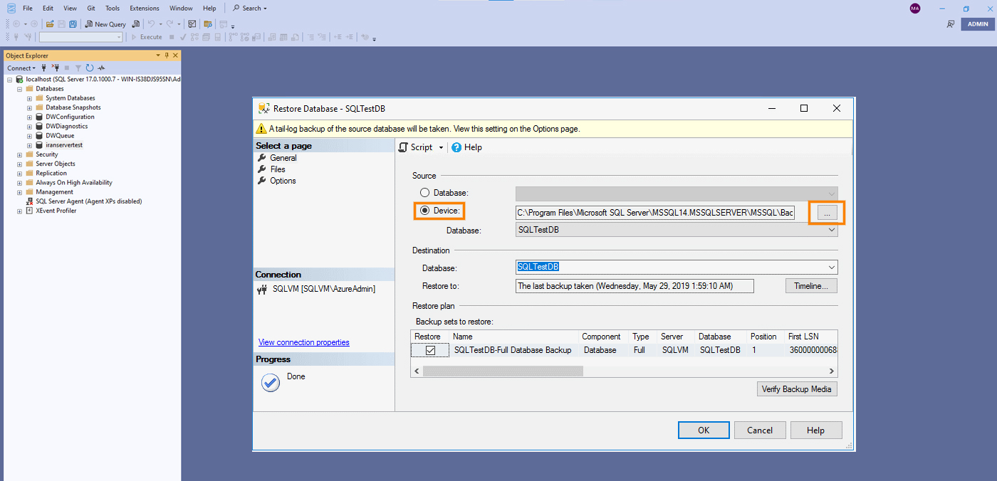 در پنجره باز شده گزینه Source در حالت پیشفرض روی “Database” است اما شما باید آن را به “Device” تغییر دهید. این کار باعث میشود بتوانید فایل bak را از مسیر دلخواه بارگذاری کنید.