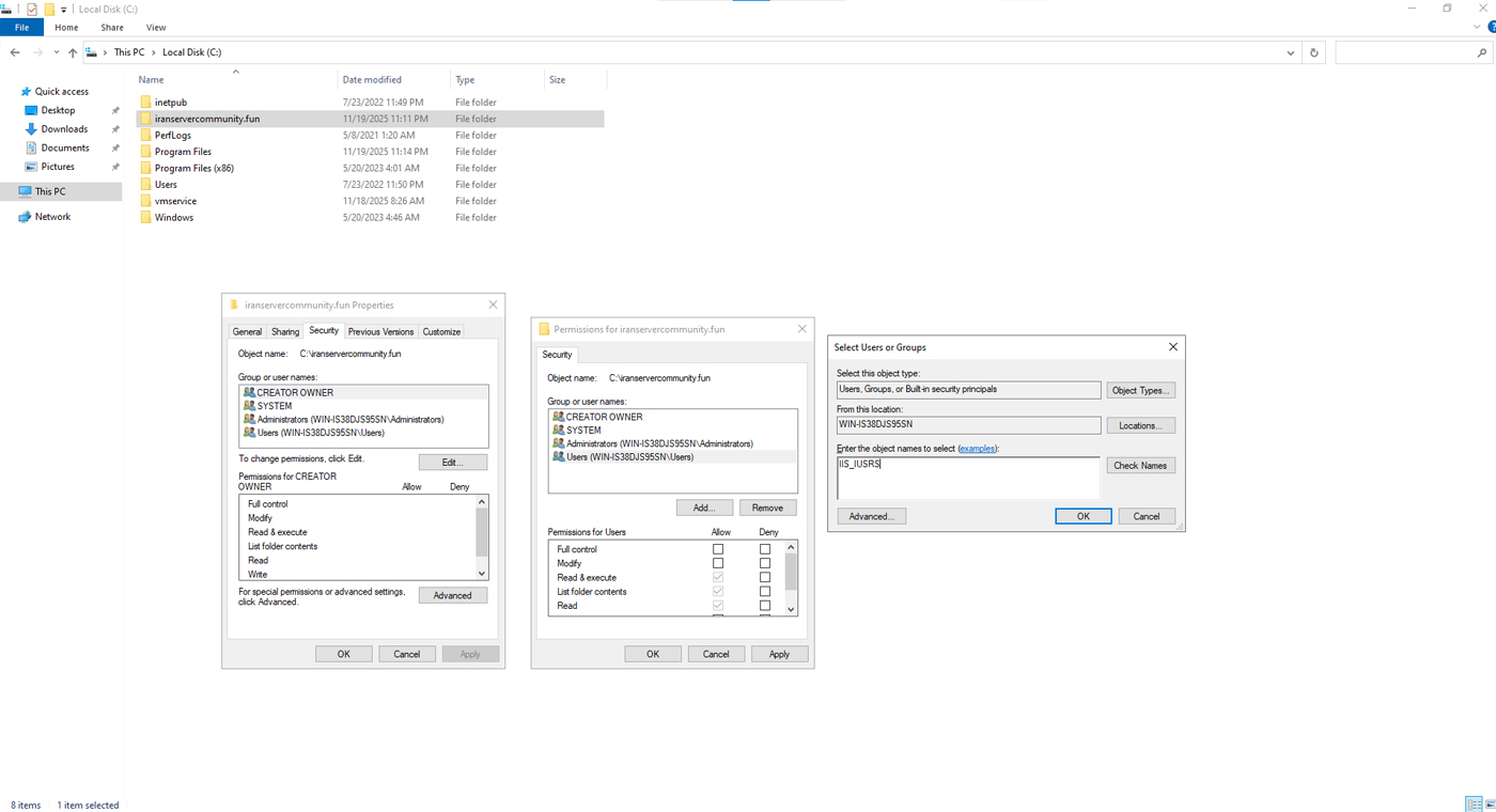 در لیست کاربران باید گروه IIS_IUSRS وجود داشته باشد زیرا IIS از طریق همین گروه فایلها را میخواند. اگر این گروه وجود نداشت روی دکمه Edit کلیک کنید و سپس Add را انتخاب کنید. در پنجره باز شده عبارت IIS_IUSRS را وارد کنید و دکمه Check Names را بزنید تا سیستم آن را تشخیص دهد. بعد از تأیید، گروه به فهرست اضافه میشود.