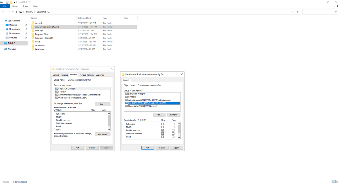 پس از اضافه شدن گروه، باید سطح دسترسی آن را تنظیم کنید. روی IIS_IUSRS کلیک کنید و مطمئن شوید گزینه Read فعال است. این سطح دسترسی برای نمایش فایلهای HTML، CSS، تصاویر و سایر محتواها کافی است. دادن دسترسی Write معمولاً لازم نیست مگر در موارد خاص که برنامه نیاز به ذخیره فایل داشته باشد.