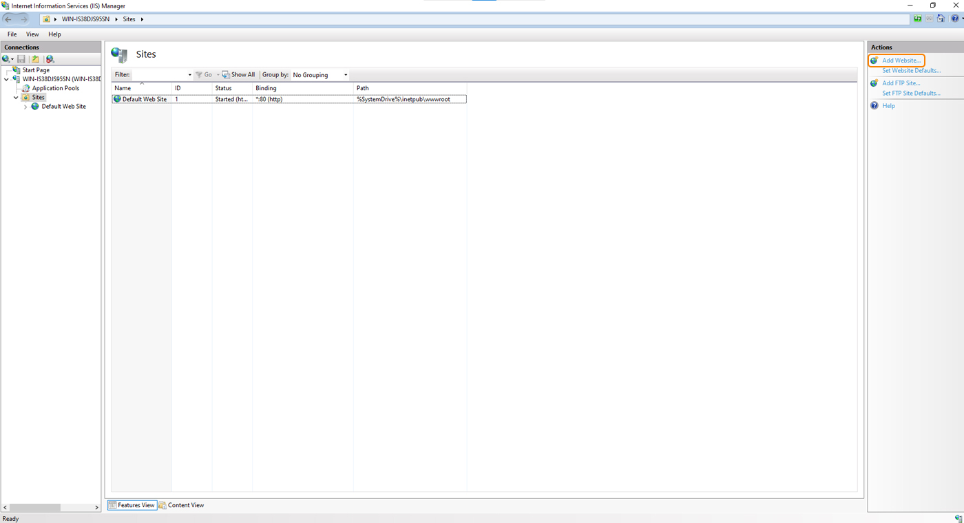 برای ایجاد یک سایت جدید باید ابتدا از ستون سمت چپ روی نام سرور کلیک کنید تا منوی کامل IIS باز شود. بعد از انتخاب نام سرور، لیست کامل امکانات IIS در مرکز صفحه ظاهر میشود. سپس در بخش Connections وارد پوشه Sites شوید. با انتخاب پوشه Sites، گزینه Add Website در ستون سمت راست با عنوان Actions نمایش داده میشود و از همانجا میتوانید سایت جدید را ایجاد کنید.