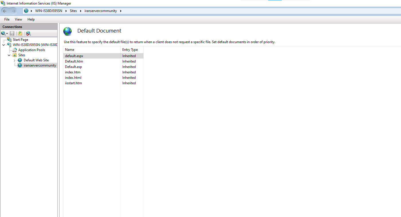در IIS گزینه Default Document را باز کنید و بررسی کنید فایل اصلی سایت مانند index.html یا default.aspx در لیست وجود داشته باشد. اگر فایل اصلی شما نام متفاوتی دارد آن را اضافه کنید تا بهعنوان صفحه شروع سایت شناخته شود.