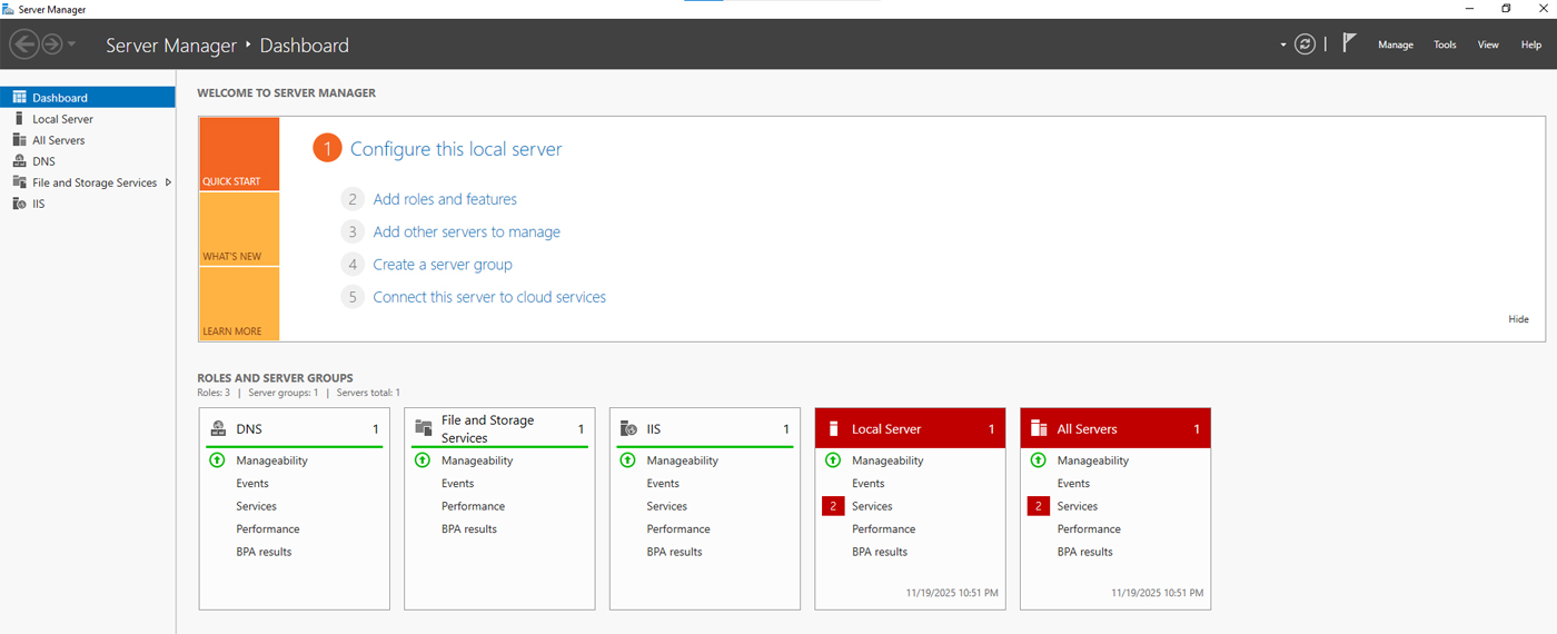 بعد از ورود از طریق RDP به سرور ویندوز باید وارد Server Manager شوید تا مطمئن شوید نقش IIS فعال است. اگر IIS نصب نشده باشد باید از بخش Add Roles and Features آن را فعال کنید. این بخش نقطه شروع مدیریت تمام نقشهای سرور است.